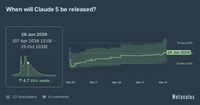 https://www.metaculus.com/questions/39304/claude-5-release-date/#15Metaculus is an online forecasting platform and aggregation engine working to improve human reasoning and coordination on topics of global importance.
